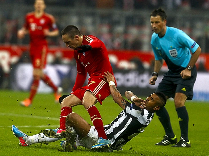 Полузащитник «Ювентуса» Артуро Видаль принимает мяч у боковой линии в центре поля, закрывает его корпусом от мчащегося к нему Рибери и спустя мгновение уже корчится от боли на газоне. Британский судья Марк Клаттенбург молчит. Замедленный повтор не рекомендуется смотреть слабонервным, беременным и ортопедам: на нем в подробностях видно, как бутса Рибери, даже не пытающаяся добраться до мяча, шипами въезжает в икроножную мышцу Видаля. Чилийская нога гнется, как резиновая, но все-таки выдерживает. Красная карточка, которую Клаттенбург должен был показать французу, могла бы повлечь за собой дисквалификацию на несколько матчей, и прошлый сезон получился бы для Рибери несколько менее триумфальным.