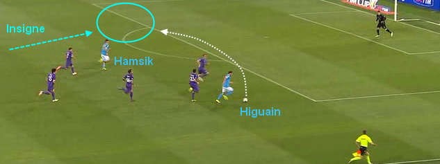 Неаполитанцы откровенно душили соперника своими контратаками, а фиалки все чаще теряли мяч на подступах к штрафной Рейны. И контроль мяча, на который сделал ставку Монтелла по-традиции, не давал дивидендов его подопечным. Два-три человека в голубом впереди на корню все старания "Фиорентины" сводили к нулю. И в течение 5 минут счет из 0-0 превратился в смертельные 0-2. И снова правый фланг защиты сыграл очень плохо. Томович не просто не попадает в кадр, он успевает ворваться в штрафную раньше Инсинье, но Игуаин поыслает мяч грамотно ему за спину. Только в нашем кадре можно наблюдать пятерых флорентийцев, еще один в попытке прервать атаку подставился под удар и сделал только хуже собственному голкиперу.