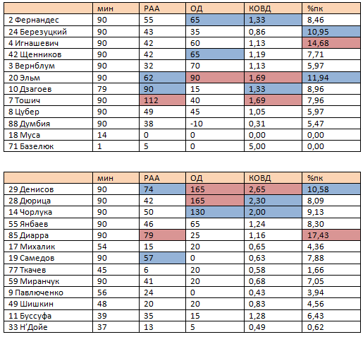 Конечно, отдельно стоит упомянуть опорников ЦСКА. Они отыграли на высшем уровне и не дали сопернику практически ничего создать через центральную зону. Эльм и Вернблум выжигали все на своем пути. Расмус отметился 4 перехватами и 4 отборами, а Понтус добавил к этому еще 3 перехвата и 4 отбора. Ко всему прочему Эльм раздал 48 передач – это второй показатель в ЦСКА, нанес 2 удара и создал 1 момент для партнера. Эти шведы выиграли для «армейцев» центр поля, чем серьезно осложнили жизнь «железнодорожникам».