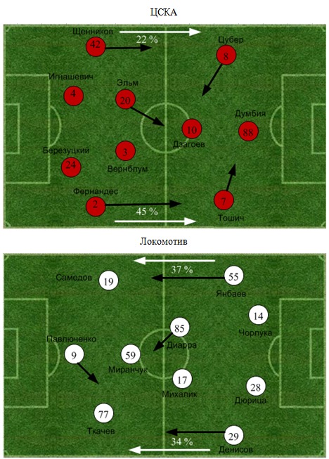 Нельзя сказать, что футболисты ЦСКА показали какой-то выдающийся уровень игры. Чаще всего они вязли в обороне соперника, до опасных моментов доходило крайне редко. Как уже говорилось, Думбия был полностью обезврежен, в связи с этим инициативу в свои руки взяли Дзагоев и Тошич. Алан чаще других угрожал воротам Гильерме, он нанес 4 удара, дважды создавал моменты для партнеров и заработал на себе 4 фола. Зоран помимо того, что стал автором победного мяча, выполнил 9 навесов и 3 раза успешно применил дриблинг. Именно правый фланг ЦСКА доставлял обороне «Локомотива» наибольшие проблемы. Через него было проведено 45% всех атак. Тошичу в этой зоне активно помогал Фернандес. Бразилец записал на свой счет 3 навеса (2 точных), 2 раза успешно применил дриблинг и заработал на себе 2 фола. Кроме того он не забывал про свои основные обязанности и стал лучшим игроком команды по перехватам – 5 штук.