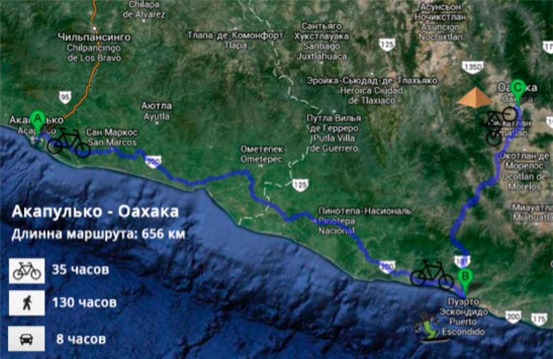 Итак, мы проложили маршрут, начинающийся в Акапулько. Вначале примерно 300 км по побережью, потом 200 км в горах, потом ещё 200 км по равнине. Финальным пунктом стал город Оахака, где рядом находятся древние пирамиды города Монте-Альбан.