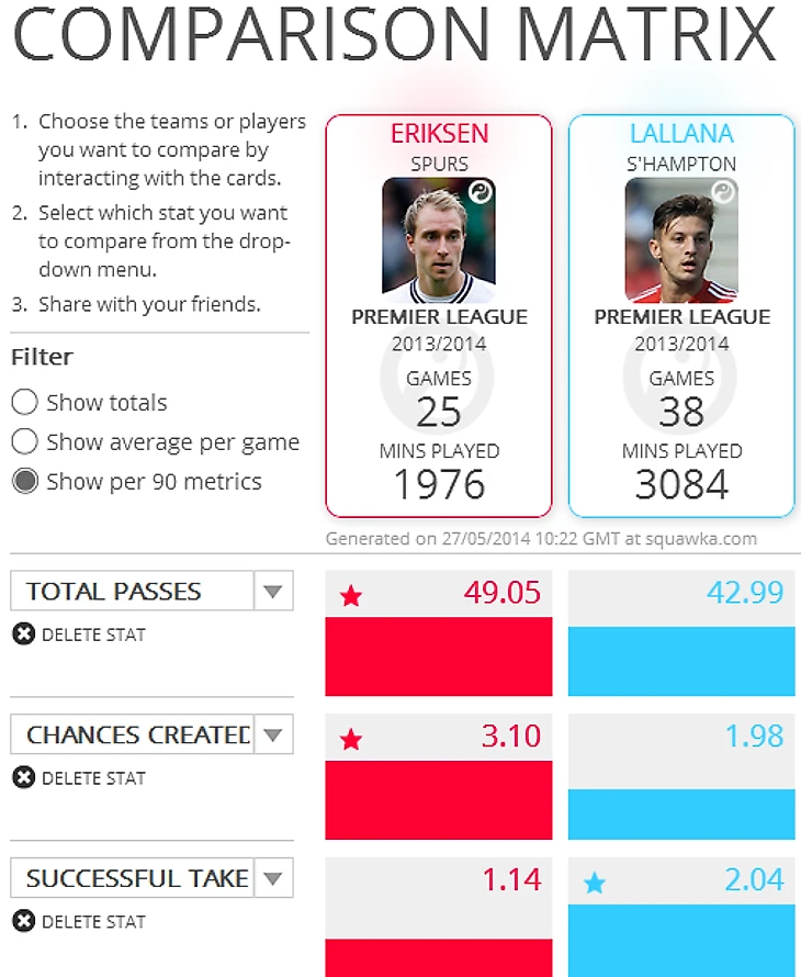 Первое среди основных предположений в контексте определения ключевых игроков – один из главных креативщиков в составе «Шпор» минувшего сезона, плеймейкер по амплуа Кристиан Эриксен вполне справится с той ролью, которую выполнял Адам Лаллана в «Саутгемптоне» при Почеттино. Не смотря на ряд проблем с адаптацией и последствиями травм на старте сезона, Кристиан сумел полностью раскрыть свой замечательный потенциал в серии матчей февраля и весеннего игрового периода. На счету молодого датчанина 7 голов и 8 ассистов в 25-ти матчах Премьер Лиги, а в общей сложности Эриксен отличился 10-ю голами и 10-ю ассистами во всех турнирах (он лучший в команде по показателю гол+пас, а также получил наивысший в клубе игровой рейтинг Whoscored по играм в АПЛ – 7.2 балла). В активе Лалланы, в свою очередь – 9 голов и 6 ассистов.