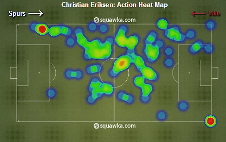 Лаллана, как и Эриксен, мог позиционироваться на фланге в стартовой позиции (только в случае Адама это правый фланг), но по ходу игры зоной его действий по сути является весь фронт атаки по ширине, а также зона от центра поля до острия нападения по вертикали. В качестве иллюстрации можно привести «heat-map» зоны действий Кристиана в матче с «Астон Виллой», а также сравнительную оценку показателей Эриксена и Лалланы. При этом по некоторым показателям потенциал датчанина выглядит предпочтительнее.