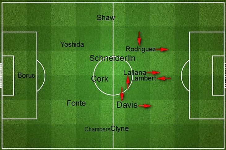 Выше приведены наиболее типичная стартовая схема «Саутгемптона» под руководством Почеттино, а также один из вариантов смены позиций в атакующей группе, часто применяемой в процессе игры (на примере матча со «Сток Сити»). Лаллана нередко переходит в зону второго форварда, а Дэвис, соответственно, занимает номинальную позицию Адама на правом фланге. Ламберт в данном примере отходит в глубину, создавая фронтально более компактную группу игроков атакующей четверки.