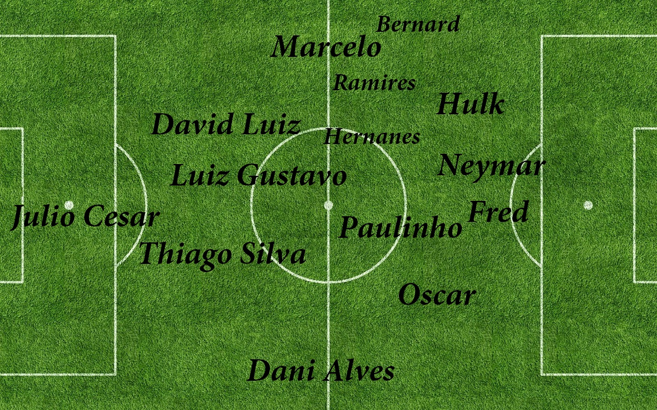 Перед вами - актуальная расстановка Бразилии. Это позиции, которые действительно занимали на поле футболисты большую часть игрового времени. Мелким шрифтом обозначены игроки, появившиеся на замену.