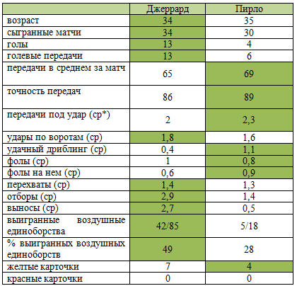 Эти футболисты будут выполнять схожие функции на поле. В первую очередь от них будет зависеть движение мяча и направление атак команды, также велика их роль при исполнении стандартных положений. Если мы сравним их статистику за последний сезон, то увидим, что Джеррард продемонстрировал более результативный футбол, он отметился 13 голами и еще 13 голевыми передачами против 4 и 6 соответственно у Пирло. Также Стивен гораздо лучше отрабатывает в обороне, он совершает в 2 раза больше отборов (2,9 против 1,4) и в 5 раз больше выносов (2,7 против 0,5) чем Андреа. С другой стороны гениальный пас Пирло никуда не исчез, он как никто умеет одним своим движением направить игровой снаряд практически в любую точку поля. Поэтому неудивительно, что по всем показателям, затрагивающим культуру паса, вырисовывается перевес итальянца. Он в среднем раздает больше передач (69 против 65) и с лучшей точностью (89 против 86), а еще чаще создает моменты для партнеров (2,3 против 2 в среднем). Посмотреть матч Англия-Италия стоит только ради того, чтобы насладиться игрой этих признанных мастеров. Не так часто на поле лицом к лицу встречаются настолько легендарные личности, являющиеся символами своей эпохи.