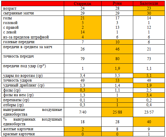 Уэйн Руни на сегодняшний момент без сомнений является главной звездой своей сборной. Он находится на пике карьеры. Ему 28 лет, сил еще вагон, и опыта уже выше крыши. Огорчает только то, что прошедший сезон был не самым удачным для его «МЮ», хотя к самому Руни претензий может быть минимум. Он как мог тащил свою команду, забил 17 мячей и отдал 10 голевых передач за 29 матчей, то есть Уэйн отмечался результативными действиями практически в каждом поединке. Любопытно сравнить его показатели с достижениями главного нападающего сборной Италии Балотелли. Мы видим, что Уэйн – это более командный игрок, способный не только завершать атаки, но и создавать их. Он раздает в среднем по 46 передач (против 21) и по 1,9 разу выводит партнеров на ударные позиции (против 1,1). Еще Руни значительно больше выполняет черновой работы: 1 отбор и 1 перехват против 0,4 и 0,2 соответственно. Что же касается Балотелли, то не стоит сомневаться в его индивидуальном мастерстве. Марио спокойно может взять всю инициативу в свои руки и решить судьбу не только эпизода, но и матча. Он способен пробить практически с любой дистанции (6 мячей из 14 были забиты дальними ударами), в среднем наносит по 5,1 выстрелу по воротам (против 3,5 у Руни). Еще Балотелли обладает приличной техникой, не боится лезть на нескольких соперников, в среднем совершает по 1,9 обводок за матч. Также Марио обычно становится большим раздражителем и заставляет оппонентов на себе фолить, что подтверждает статистика, он зарабатывает в среднем по 3,4 фола для своей команды. Конечно, всем известны проблемы с дисциплиной у этого итальянца, но если он сможет держать себя в руках, то станет большой проблемой для обороны соперника.