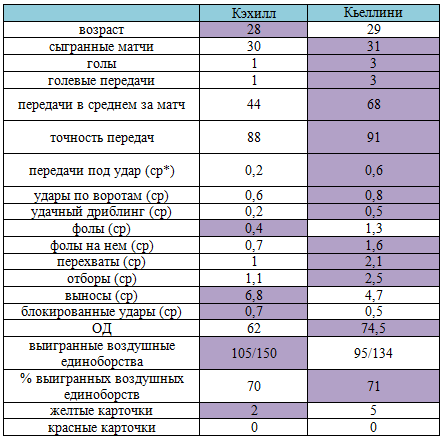 Статистика, конечно, вещь обманчивая, да и Кьеллини из-за стиля игры «Ювентуса» чаще ходил в атаку, но все же показательно, что Джорджо значительно превосходит своего оппонента по большинству компонентам. В первую очередь это касается созидательной игры. Он действует результативнее (3 гола + 3 голевых паса против 1+1), чаще бьет по воротам (0,8 удара против 0,6), и точнее выдает передачи (91% точности против 88). Также Кьеллини увереннее себя чувствует в ситуациях, когда ему приходится обороняться один в один. Он совершает в 2,5 раза больше отборов (2,5 против 1,1) и 2 раза больше перехватов (2,1 против 1). Кэхилл имеет превосходство лишь по выносам (6,8 против 4,7) и заблокированным ударам (0,7 против 0,5), что в целом не меняет общей картины. Следует признать, что на данный момент Джорджо все-таки защитник более высокого уровня, чем Гари.