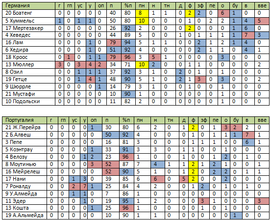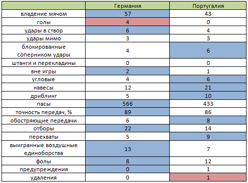Несмотря на счет нельзя сказать, что немцы полностью доминировали на поле и разрывали соперника. Подшефные Лева в присущем им стиле действовали предельно прагматично и расчетливо. Обе команды нанесли по 13 ударов, но если футболисты сборной Германии 6 раз попали в створ и забили 4 мяча, то португальцы только 4 раза заставили Нойера вступить в игру и так не сумели его распечатать. Еще немецкие игроки имели территориальное преимущество (57% владение мячом), лучше смотрелись при отборе мяча (22 против 14) и чаще выигрывали воздух (13 против 7). Подопечные Бенту были вынуждены большую часть матча отыгрываться, поэтому нет ничего удивительного, что они выполнили больше навесов (21 против 12) и чаще сбивались на индивидуальные действия (10 обводок против 5).