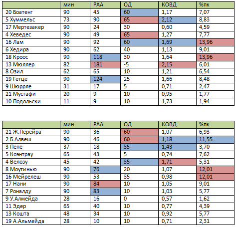 Рейтинг атакующей активности (РАА): гол – 50, голевая передача (заработанный пенальти, забитый пенальти) – 25, точная передача– 1, удар в створ – 10, удар мимо– 5, обостряющая передача – 5, удачный дриблинг– 5, заработанный штрафной – 5, навесы: точные – 3, неточный – 1. Рейтинг оборонительных действий (ОД): перехват - 10, отбор – 10 и блокированный удар – 10, выносы мяча из своей штрафной - 5, фолы – (-5). Коэффициент объема выполненных действий (КОВД) определяется по формуле (РАА+ОД)/мин, то есть он равен сумме выполненных действий футболиста деленной на проведенные минуты. %пк – процент передач игрока от общего количества передач команды.