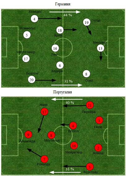 Теперь перейдем к немцам. Лев выставил весьма неоднозначный состав. Во-первых, на скамейке сборной Германии остался Клозе, а место на острие занял Мюллер, который больше привык действовать на фланге или из глубины. Во-вторых, в центре поля появилось такое неоднозначное сочетание как: Лам-Хедира-Кроос. Филипп, как казалось, был бы полезнее на фланге (против Роналду), но тренер решил иначе. Хедира в свою очередь пропустил значительную часть сезона из-за травмы, но, как видим, не потерял место в основе сборной. В-третьих, использование на флангах Боатенга и Хеведеса против Роналду и Нани выглядело очень рискованно. Все-таки и Жером, и Бенедикт по своей сути являются центральными защитниками, и им вполне могло не хватить скорости, чтобы сдержать португальские фланги.