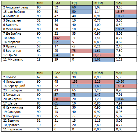 Рейтинг атакующей активности (РАА): гол – 50, голевая передача (заработанный пенальти, забитый пенальти) – 25, точная передача– 1, удар в створ – 10, удар мимо– 5, обостряющая передача – 5, удачный дриблинг– 5, заработанный штрафной – 5, навесы: точные – 3, неточный – 1. Рейтинг оборонительных действий (ОД): перехват - 10, отбор – 10 и блокированный удар – 10, выносы мяча из своей штрафной - 5, фолы – (-5). Коэффициент объема выполненных действий (КОВД) определяется по формуле (РАА+ОД)/мин, то есть он равен сумме выполненных действий футболиста деленной на проведенные минуты. %пк – процент передач игрока от общего количества передач команды.