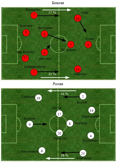 Капелло после не самого удачного поединка против Южной Кореи с плеча рубить не стал, он сделал всего 2 перестановки в стартовом составе. На правый фланг обороны вышел Козлов, наверное, специально под Азара, а на левой бровке весьма неожиданно Жиркова заменил Канунников. К Максиму особых претензий предъявить нельзя, он старался, как мог и игру уж точно не портил. На его счету 2 удара (1 в створ), 2 успешные обводки и 2 заработанные на себе фола, также он активно помогал в обороне Комбарову сдерживать в первую очередь Мертенса, что подтверждают его 2 перехвата, 2 отбора и 2 выноса. Вообще нужно сказать, что основные боевые действия развернулись именно на флангах. Бельгийцы 37% атак провели через бровку Азара и 45% через противоположный край. Наши игроки в свою очередь 44% отдали на откуп Самедову и Козлову, а 38% Канунникову и Комбарову. Если фланг Максима и Дмитрия, пусть скрипя и шатаясь, но сдержал натиск соперника, то вот противоположная бровка все-таки пала и сдала всю крепость. Азар в конечном итоге добился своего, он пролез по своему краю и выкатил игровой снаряд Ориги, который и стал автором победного мяча. Эден, без сомнения, стал главным героем встречи, он планомерно усиливал давление на оборону нашей команды, постоянно шел с дриблингом в проходы (8 успешных обводок), искал своих партнеров острыми передачами (4 паса под удар) и дважды пробил сам. Как это ни печально, но старания Азара дали свой результат.