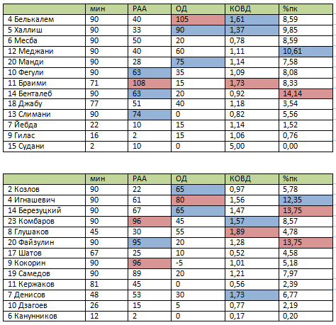 Рейтинг атакующей активности (РАА): гол – 50, голевая передача (заработанный пенальти, забитый пенальти) – 25, точная передача– 1, удар в створ – 10, удар мимо– 5, обостряющая передача – 5, удачный дриблинг– 5, заработанный штрафной – 5, навесы: точные – 3, неточный – 1. Рейтинг оборонительных действий (ОД): перехват - 10, отбор – 10 и блокированный удар – 10, выносы мяча из своей штрафной - 5, фолы – (-5). Коэффициент объема выполненных действий (КОВД) определяется по формуле (РАА+ОД)/мин, то есть он равен сумме выполненных действий футболиста деленной на проведенные минуты. %пк – процент передач игрока от общего количества передач команды.
