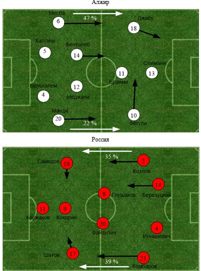 Безусловно, нужно отдать должное нашим соперникам, их самоотверженной игре. В их составе особенно выделялись Бенталеб, Браими и Фегули, которые управляли действиями своих партнеров. Набиль был главным диспетчером команды, он выполнил больше всех передач в составе Алжира – 56, именно он связывал линии обороны и нападения. Софьян носился по всему фронту атаки, искал свободные зоны, если нужно мог придержать мяч или задать ему нужное направление. Также он довольно усердно участвовал в обороне, что подтверждают его 1 перехват и 3 отбора. От Ясина же исходило больше всего остроты. Он трижды выводил партнеров на ударные позиции, поэтому неудивительно, что именно его пас стал голевым, нанес 1 удар и заработал на себе 4 фола. В обороне необходимо выделить пару центральных защитников Белькалема и Халлиша. Несмотря на то, что мяч Кокорина в значительной степени на их совести, в дальнейшем они практически не ошибались и отметились внушительными показателями. У первого 5 перехватов (лучший в матче), 1 отбор, 1 заблокированный удар и 9 выносов, а у второго 3 перехвата, 2 отбора и 8 выносов.