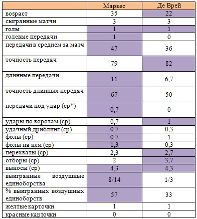 Маркес славится своей универсальностью еще по выступлениям за «Барселону», где ему неоднократно приходилось действовать не только на позиции центрального защитника, но и закрывать опорную зону. Маркес обладает великолепным пасом и способен доставить мяч практически в любую точку поля. Поэтому неудивительно, что он превосходит Де Врея практически по всем атакующим показателям. Особенно мексиканец выделяется своей культурой паса, в среднем он раздает на 11 передач больше Де Врея, причем отдельного внимания заслуживают длинные пасы Рафаэля. Он в среднем выполняет по 11 длинных переводов с точностью в 67%. Голландцам необходимо быть готовыми к тому, что Маркес одним своим движением может со своей половины поля вывести партнера на ударную позицию, неслучайно он создал за 3 матча два момента, один из которых был реализован (1 голевая передача). Отлично Рафаэль чувствует себя в воздухе, он выигрывает 57% воздушных единоборств против 33% у Де Врея. Что касается оборонительных показателей, то здесь надежнее выглядит Стефан. Он молод, агрессивен и смел. Превосходит мексиканского ветерана и по перехватам (2,7 против 2,3), и по отборам (3,7 против 2). Здесь еще следует сказать, о просто ни с чем не сравнимой роли Маркеса в раздевалке своей команды, он настоящий капитан и лидер.