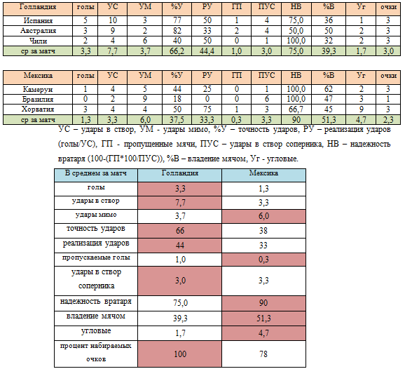 Сборная Голландии на этом турнире славится своими быстрыми атаками. В среднем они всего 39% времени контролируют мяч, что не мешает им быть одной из самых острых команд. В среднем за поединок они наносят по 7,7 удара в створ и забивают по 3,3 мяча. Просто какая-то «антитики-така». У мексиканцев на это есть свой ответ. Они пропусти всего 1 гол, а надежность их вратаря достигает 90% (9 сейвов из 10 ударов в створ). «Найдет ли голландская коса на мексиканский камень?» – главный вопрос данного противостояния.