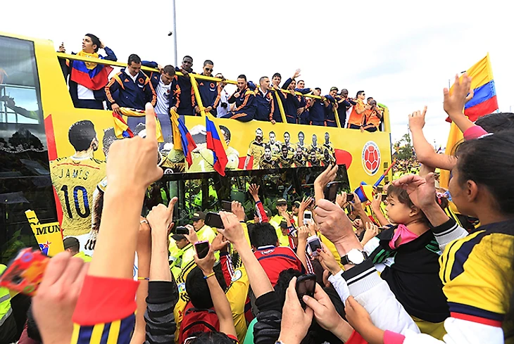 Двухэтажный автобус с игроками и тренерами сборной Колумбии на маленькой скорости проезжал мимо толп болельщиков на нескольких крупных улицах города. Болельщики окружали автобус на протяжении всех двух часов, что тот был в пути. Творилось полное безумие.