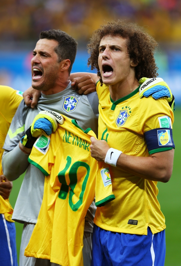 Жулио Сезар (слева) и Давид Луис поют гимн Бразилии перед матчем против Германии. Фото Getty Images