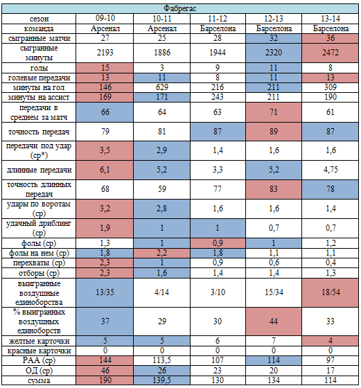 Нужно, конечно, отметить, что, несмотря на множество разговоров про то, что Сеск – воспитанник "Барселоны", и ему нужно было вернуться домой, родным каталонский клуб по-настоящему для Фабрегаса так и не стал. Все-таки родина не там, где ты родился, а там где ты нужнее и где в тебя верят. Венгер в него верил, и цифры подтверждают данный факт. После переезда в Испанию некоторые определяющие показатели заметно упали. Испанец более чем в 2 раза стал меньше создавать моментов для партнеров, в "Арсенале" этот показатель был равен 3,5 в среднем за матч, в "Барселоне" же снизился до 1,6. Количество ударов по воротам также поползло вниз, в последнем сезоне он наносил в среднем по 1,4 выстрела за матч, в то время как 5 лет назад Фабрегас ничего не боялся, и 3,2 удара за встречу тому подтверждение. Еще бросается в глаза практически гениальная игра Сеска в 2010 году в обороне, для игрока его амплуа – созидателя и творца чистой воды, 2,3 отборов и 2,3 перехватов в среднем за поединок – потрясающая статистика. До таких цифр он больше уже не поднимался. В последнем сезоне за "Арсенал" Фабрегаса постоянно беспокоили травмы, и возможно из-за этого он начал себя беречь. Резко снизилась оборонительная работа (до 1,6 отборов и 1 перехвата в среднем), уменьшилось и количество успешных обводок практически в 2 раза (с 1,9 раза до 1). Поэтому как это не больно осознавать канонирам Венгер сделал вполне оправданный ход, отпустив Сеска в "Барселону".