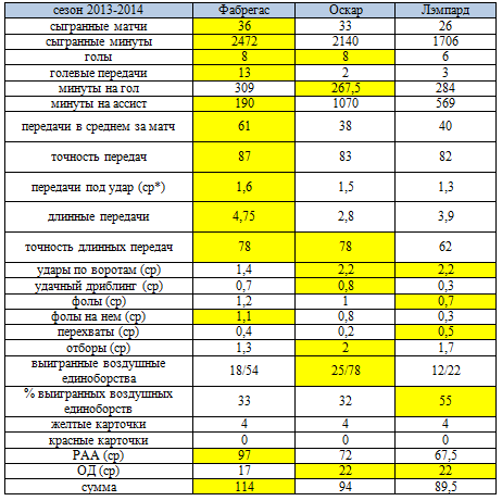 На данный момент не совсем понятно, в какой роли видит Моуринью Фабрегаса. Возможно, он пришел на позицию Лэмпарда, которого отправили покорять США, а может быть он будет действовать гораздо ближе к атаке. Чтобы немного разобраться в ситуации, сравним статистику Оскара, Лэмпарда и Фабрегаса в прошлом сезоне.