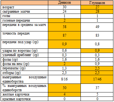 Опираясь на статистику прошлого сезона, можем сделать вывод, что Денисов превосходит Глушакова в качестве передач. Игорь раздает в среднем больше пасов (58 против 49) и с более высокой точностью (87% против 83%), также он немного лучше умеет создавать моменты для партнеров (0,9 в среднем против 0,8) и чаще заставляет соперников на себе нарушать правила (2 против 0,9). Денис в свою очередь обладает более поставленным ударом, что он уже успел продемонстрировать в первом матче нынешнего сезона, со штрафного поразив «девятку» ворот «Рубина». Глушаков чаще, чем Денисов угрожает воротам соперников (0,9 ударов в среднем против 0,6) и старательнее отрабатывает в обороне, что подтверждает его превосходство по количеству отборов (2,5 против 2,3) и перехватов (2,5 против 1,3). Эта дуэль обещает быть весьма захватывающей и наверняка станет одной из ключевых в поединке.