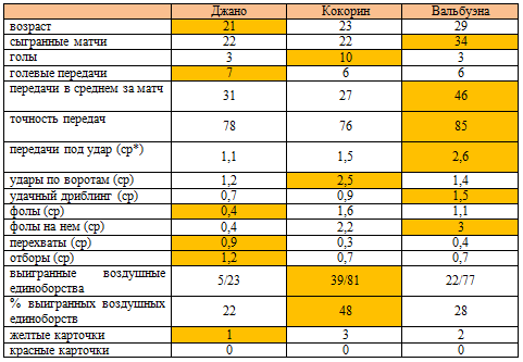 Не стоит сомневаться, что Вальбуэна – это опытный и состоявшийся мастер, его сильнейшей стороной является умение вести игру и раздавать обостряющие передачи. Ананидзе в этом плане серьезно на данный момент уступает французу. Джано в среднем за матч создает всего 1,1 момента для партнеров, а у его оппонента эта цифра достигает 2,6, также француз лучше вооружен технически (1,5 обводок в среднем против 0,7) и чаще зарабатывает на себе штрафные удары (3 раза в среднем против 0,4). Перевес спартаковца наблюдается только по части работы в обороне, он лучше выглядит в отборе (1,2 в среднем против 0,7) и при перехватах мяча (0,9 против 0,4).