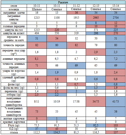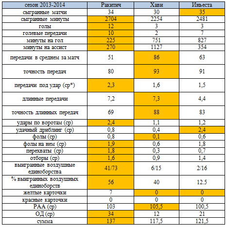 Нужно сказать, что  на фоне этих двух признанных мастеров показатели Ракитича выглядят весьма достойно. Он, конечно, в культуре паса уступает Хави. Смотрите сами, испанец выполняет в среднем по 86 передач с фантастической точностью в 93%, к тому же он еще и длинных переводов делает по 7,3 за встречу при точности 88%. У хорвата все гораздо скромнее: 51 пас при 80% точности и 7,2 длинных перевода при 69% точных. Иньесте Иван солидно проигрывает в технике, Андрес в среднем выполняет по 2,4 успешные обводки за поединок, у Ракитича только 0,8. Зато во всех остальных компонентах хорват не уступает прославленным испанцам. Он показал в прошлом сезоне значительно лучшую результативность, что подтверждают его 12 мячей и 10 голевых передач, у Хави и Иньесты в сумме всего 6 и 9 соответственно. Исходя из этого, неудивительно, что он действовал гораздо острее и больше моментов создавал для партнеров – по 2,3 (Хави – 1,6, Иньеста – 1,5), а также чаще примерялся к воротам соперников – по 2,4 удара (Хави – 1,1, Иньеста – 1,2). Ракитич кроме всего прочего и в обороне проявил себя лучше. У хорвата есть неплохие шансы со временем всзять на себя все основные функции Хави, а пока он, скорее всего, будет играть с ним в паре. В центре поля у «Барсы» будет образован кулак из Бускетса, Ракитича и Хави, что должно по сравнению с прошлым сезоном повысить как надежность обороны, так и добавить несколько вариантов впереди, так как хорват обладает не только отличным последним пасом, но и поставленным дальним ударом.