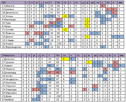 г- гол; гп –голевая передача; ус-удары в створ; у -удары всего; оп – обостряющая передача (передача, после которой партнер по команде наносит удар), п – передачи всего; %п - точность передач; пн – количество неточных передач, н –навесы, тн – точные навесы; д - удачный дриблинг (обыгрыш один в один); ф - фолы; зф –сфолили на нем; пе – перехваты; о – отборы; бу – блокированные удары; в - выносы мяча из своей штрафной площади; вве – выигранные воздушные единоборства.