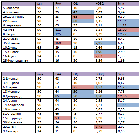 Рейтинг атакующей активности (РАА): гол – 50, голевая передача (заработанный пенальти, забитый пенальти) – 25, точная передача– 1, удар в створ – 10, удар мимо– 5, обостряющая передача – 5, удачный дриблинг– 5, заработанный штрафной – 5, навесы: точные – 3, неточный – 1. Рейтинг оборонительных действий (ОД): перехват - 10, отбор – 10 и блокированный удар – 10, выносы мяча из своей штрафной - 5, фолы – (-5). Коэффициент объема выполненных действий (КОВД) определяется по формуле (РАА+ОД)/мин, то есть он равен сумме выполненных действий футболиста деленной на проведенные минуты. %пк – процент передач игрока