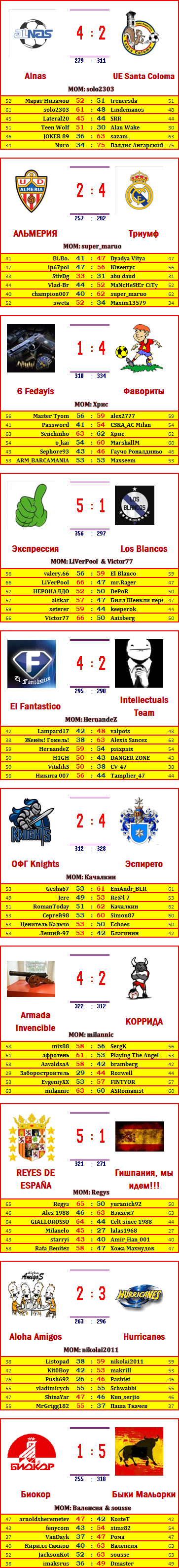 Перехожу к итогам 1 тура командного турнира. Здесь я ввел нововведение в виде MOM (лучший игрок матча) в каждом противостоянии. Лучшим игроком матча будет считаться игрок (или игроки) победившей команды, который набрал наибольшее очко в туре (если даже в личной встрече проиграет оппоненту, смотреть ниже Хрис). Эти достижения будут учитываться до конца сезона и будет объявлен список игроков, многократно становившихся MOM. Возможно будет голосование главных тренеров команд, чтобы выявить лучшего игрока сезона. Поживем, увидим) Дерзайте, становитесь лучшими!