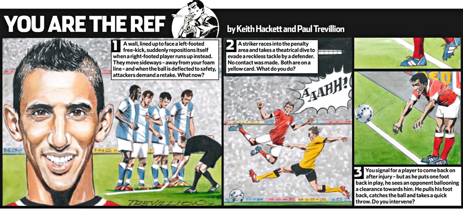Вопросы: 1. Штрафной удар. Стенка располагается с учётом того, что удар будет нанесён левой ногой. Однако как только футболисты в стенке видят, как к мячу бежит правоногий футболист, они смещаются вбок, в сторону от линии, проведенной вами исчезающим спреем. В итоге мяч попадает в стенку, и футболисты команды, исполнявшей штрафной, требуют повторного удара. Ваши действия?