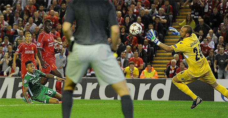 Марио Балотелли забивает первый гол за «Ливерпуль». Вид сзади.