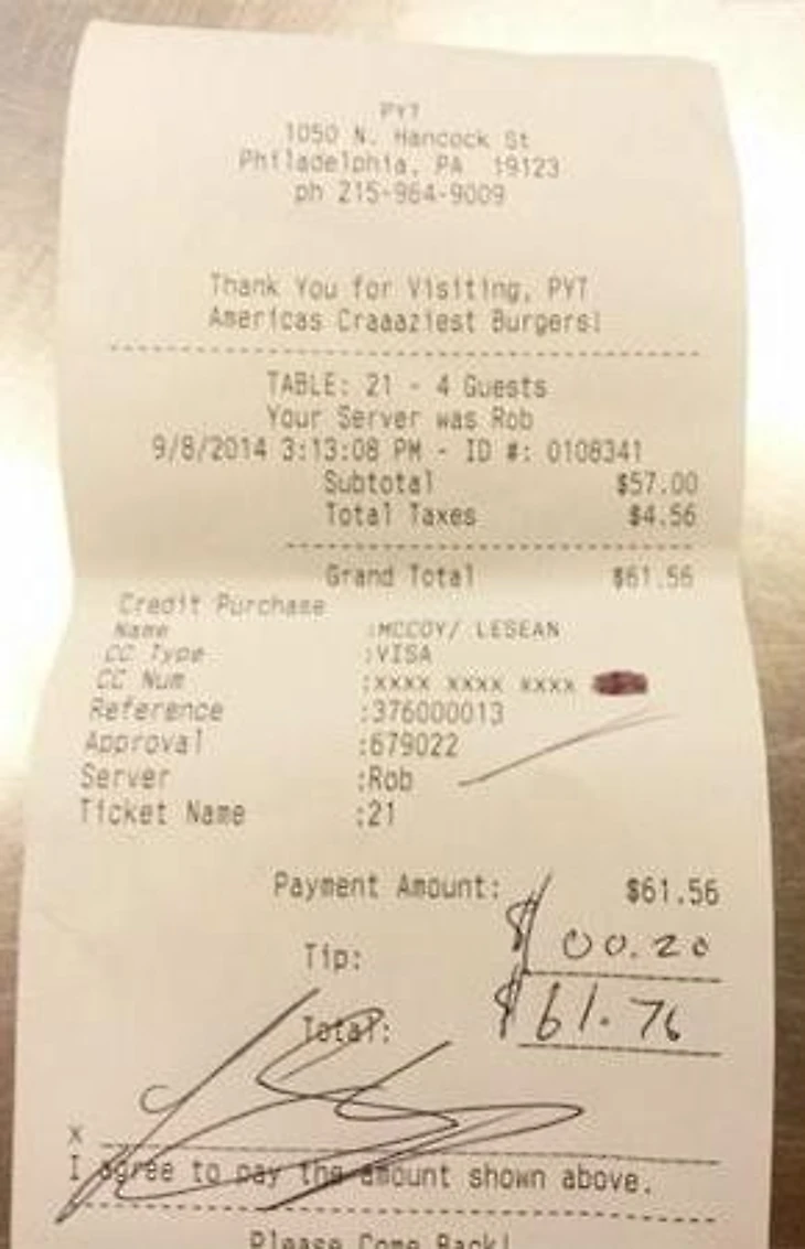 Суперзвезда НФЛ Лешон Маккой на прошлой неделе попал в новости из-за того, что оставил 20 центов на чай персоналу бургерной PYT. Владелец заведения выложил фотографию счета Маккоя в фейсбук и рассказал, что футболиста и его друзей идеально обслужили, хотя они очень плохо обращались с официантом.