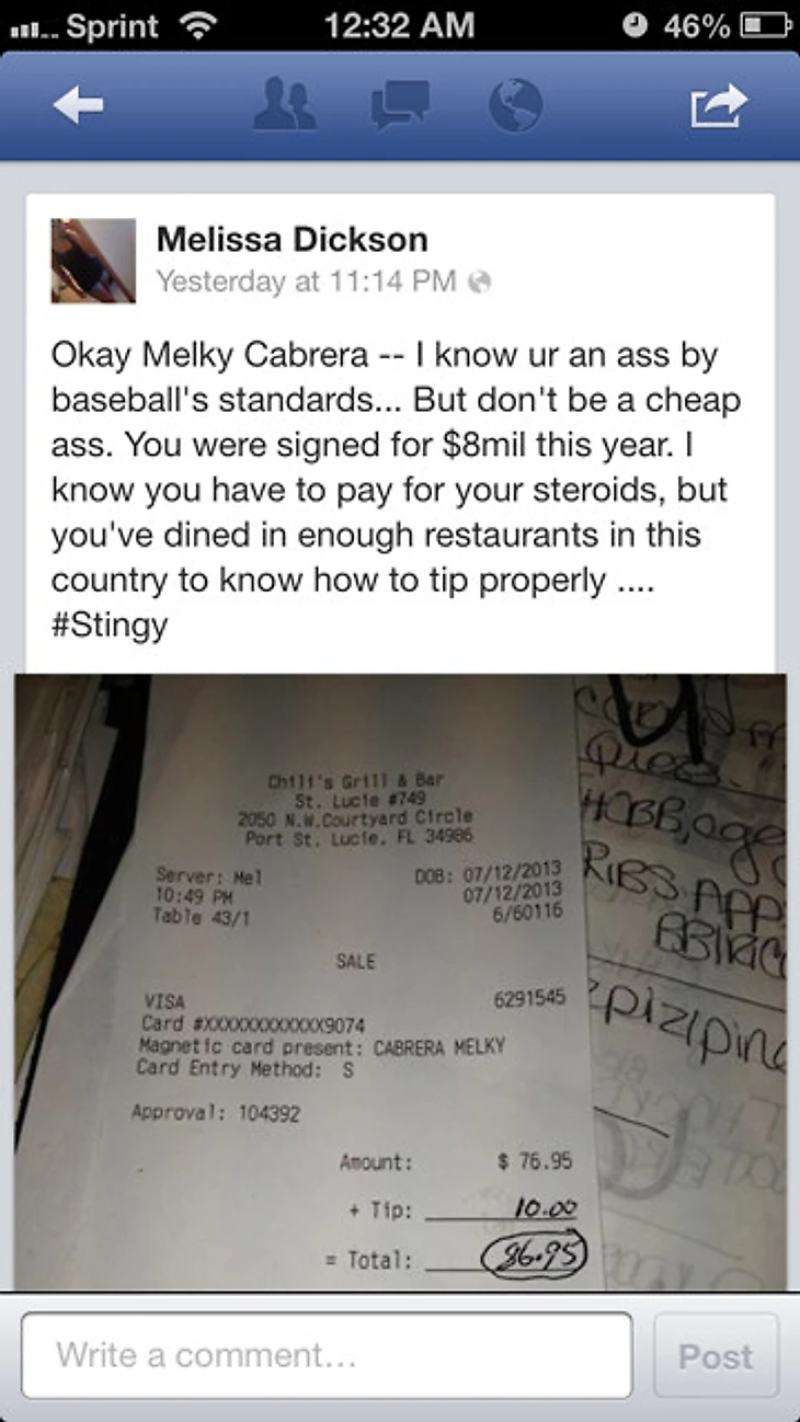 Бейсболисту «Торонто» Мелки Кабрере сильно не повезло. Чаевые в 10 долларов при счете на 77 долларов – это не так плохо. К несчастью Кабреры, его официантка оказалась бейсбольным блогером и выложила фотографию счета в интернет, подписав: «Я знаю, что вам нужно платить за стероиды, но вы посетили достаточно ресторанов, чтобы знать, что такое нормальные чаевые».