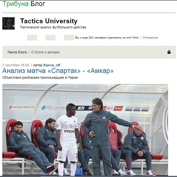 С моей стороны ссылки будет всего 3, т.к. из интересующих меня команд («Спартак» (Москва) и «МЮ»), я знаю именно столько хороших блогов с качественной и постоянной тактической аналитикой. Если данные блоги прибавят в количестве почитателей, я буду только рад: