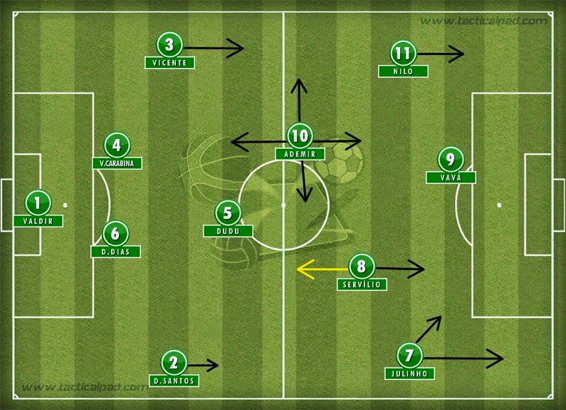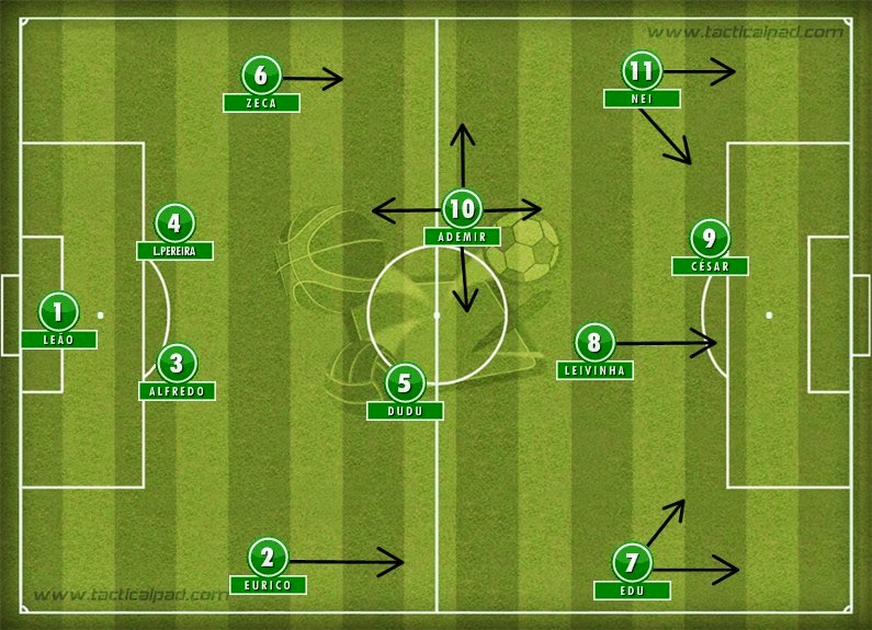 В то время Палмейрас играл по схеме 4-2-4. Однако для оборонительной игры использовал 4-3-3 (Servílio оттягивался назад). Ademir da Guia быд meio-de-campo (атакующий полузащитник).