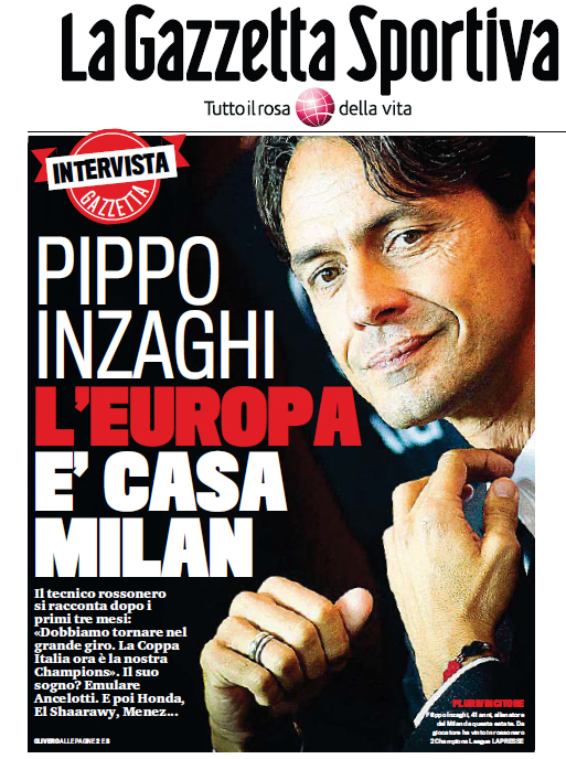 «Я останусь здесь до сих пор, пока не смогу сравняться со своим учителем Анчелотти, который выиграл Лигу Чемпионов сначала как игрок, а потом как тренер. Мечтатель? Да. Сумасшедший? Нет. Пиппо Индзаги прекрасно знает, что для этого потребуется много времени, много работы, достижение важных промежуточных целей и поддержка клуба. В этом своем первом большом интервью Пиппо просит дать ему необходимое время, обещает непрерывно работать и ставит две важные цели: победа в Кубке Италии и возвращение в Европу, и при этом не сваливает все на помощь клуба, которая может подразумевать не что иное, как великие приобретения. Слова Индзаги звучат убедительно, и теперь мы не удивляемся тому, что за несколько недель он сумел превратить группу игроков в команду, пусть с известными пределами, но зато с желанием их преодолеть. Там, где не хватает ног, помогает сердце. Там где не хватает класса, помогает голова. Так «Милан» снова открыл для себя удовольствие произносить вслух такие слова, как «проект», «будущее», «амбиции». И это благодаря своему тренеру.