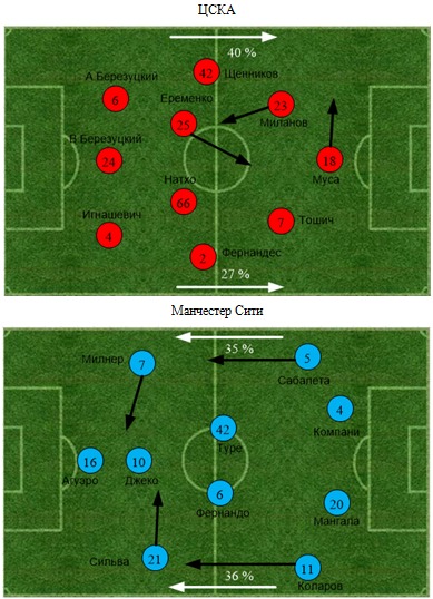 Уже по стартовому составу было понятно, что хозяева в первую очередь рассчитывают на плотность и надежность своих оборонительных редутов. Тренер ЦСКА выпустил сразу 3 центральных защитников: братьев Березуцких и Игнашевича. За фланги отвечали Щенников и Фернандес. В центре поля расположились Натхо и Еременко, сюда же опускался и Миланов. Тошич привычно действовал ближе к правой бровке, а на острие был отправлен Муса. Очевидно, что данная тактика была нацелена на быстрые контратаки, завершать которые должны были Зоран и Ахмед. В центральной же зоне была создана максимальная плотность (6 игроков), для того чтобы не дать развернуться в первую очередь лидерам англичан: Агуэро, Сильве и Туре.