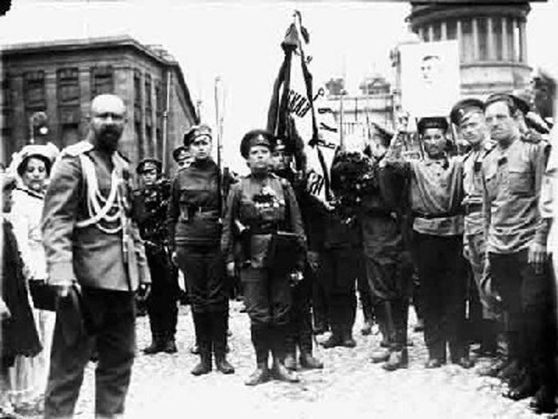 Группа солдат женского батальона с Марией Бочкаревой (стоит слева от знаменосца) у Мариинского дворца с портретом А.Ф. Керенского. Петроград, 21 июня 1917 года.