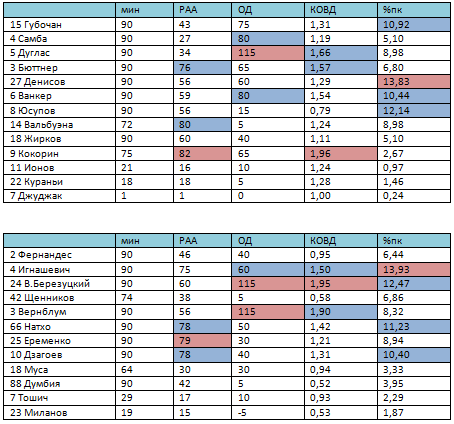Рейтинг атакующей активности (РАА): гол – 50, голевая передача (заработанный пенальти, забитый пенальти) – 25, точная передача– 1, удар в створ – 10, удар мимо– 5, обостряющая передача – 5, удачный дриблинг– 5, заработанный штрафной – 5, навесы: точные – 3, неточный – 1. Рейтинг оборонительных действий (ОД): перехват - 10, отбор – 10 и блокированный удар – 10, выносы мяча из своей штрафной - 5, фолы – (-5). Коэффициент объема выполненных действий (КОВД) определяется по формуле (РАА+ОД)/мин, то есть он равен сумме выполненных действий футболиста деленной на проведенные минуты. %пк – процент передач игрока