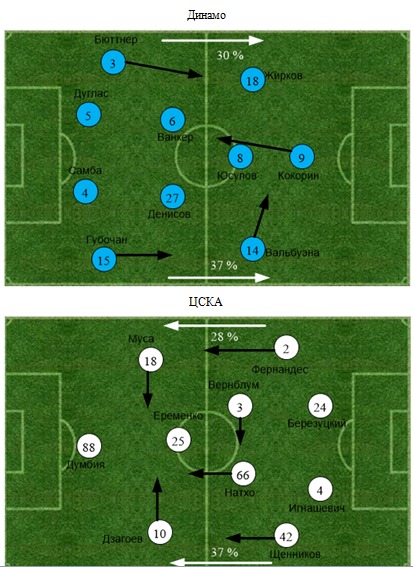Слуцкий со стартовых минут выпустил абсолютно тот же состав, что и против «Манчестер Сити». В итоге первые мгновения матча прошли с небольшим преимуществом «Динамо». Сейчас уже можно говорить, что тренер ЦСКА допустил просчет, нужно было провести хотя бы небольшую ротацию. Тот же Тошич и Миланов вполне могли выйти в стартовом составе. Но этого не случилось. Усталость футболистов средней линии в первую очередь сказалась на точности их передач. Никто из полузащитников ЦСКА не преодолел отметку в 80% точных пасов. Для сравнения у хозяев оба опорника и Вальбуэна раздавали передачи с точностью близкой к 90%: у Денисова – 89%, у Ванкера – 86%, у Матье – 84%. Большое количество брака не давало доводить комбинации до логического завершения. Думбия редко получал снаряд вблизи ворот соперника, он нанес всего 1 неточный удар и выполнил 1 обостряющую передачу. Игра явно не задалась у форварда гостей. А если не забивает Сейду, и арбитр не ставит пенальти в пользу ЦСКА, то команде Слуцкого крайне сложно даются очки.