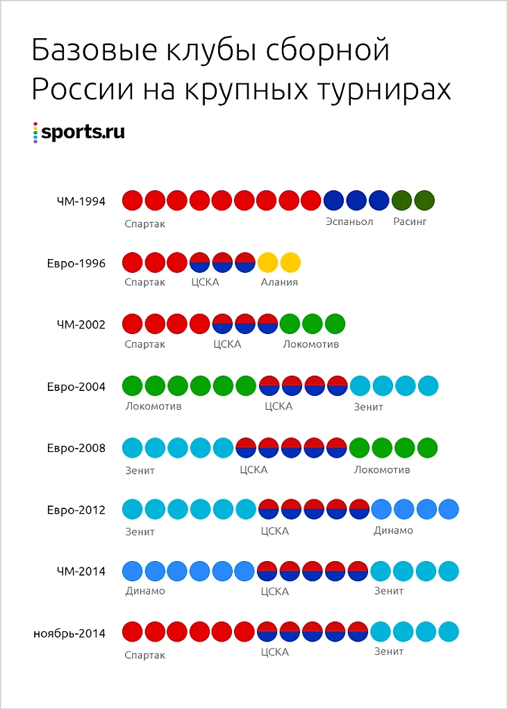 Инфографика Sports.ru о базовых клубах сборной России на крупных турнирах и прямо сейчас.