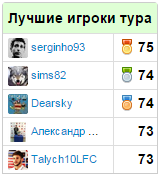Лучший результат тура: sims82 из вышеупомянутой команды с этой командой: (74 очка)