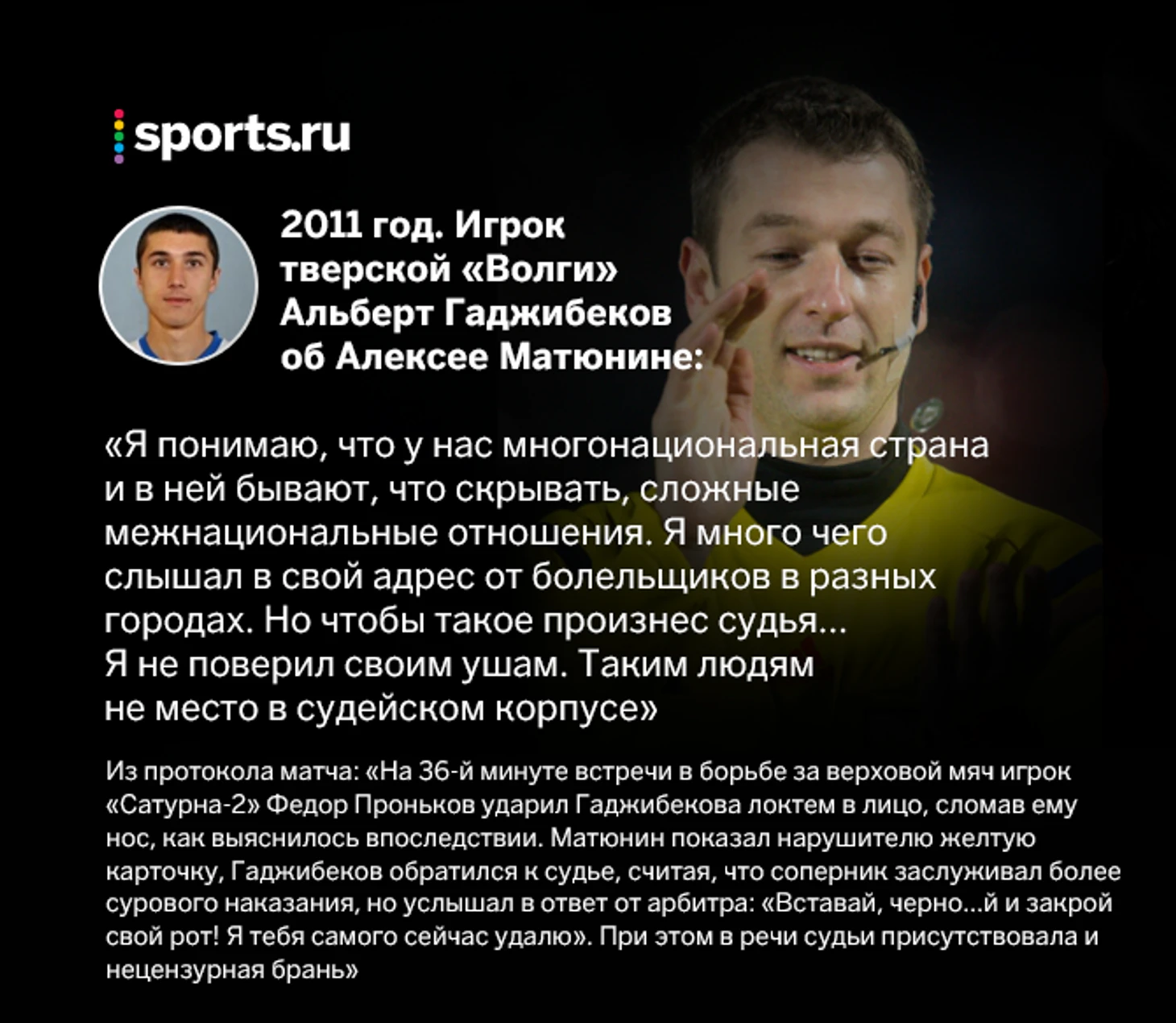 Отец Алексея Матюнина Валерий семь лет играл за «Динамо», в середине девяностых доиграл в Гонгконге, а до 2005-го работал судьей. Два его сына, Максим и Алексей, тоже стали судьями. Старший, Алексей, несколько лет назад нарвался на годичную дисквалификацию за оскорбление дагестанца Гаджибекова во второй лиге, а в субботу, по словам Халка, сказал ему: «Мне не нравишься ты и не нравятся черные».