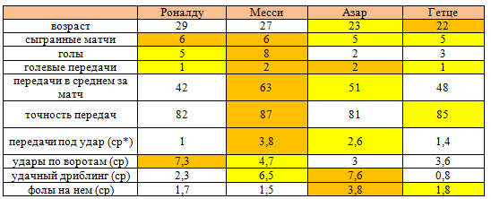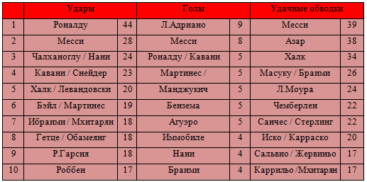 Эдену и Марио нужно серьезно попотеть, чтобы по уровню приблизиться к Лионелю и Криштиану. Азар сейчас на полшага ближе Гетце к прославленным звездам, он даже сумел обойти Месси по среднему количеству обводок за матч, бельгиец успешно применяет дриблинг по 7,6 раза, а аргентинец только 6,5, в остальном он уступает Лионелю, особенно большая пропасть в результативности. Месси забил 8 мячей, а у Азара только 2. Криштиану Роналду ожидаемо нанес больше всех ударов по воротам – 44 за 6 игр, по 7,3 в среднем. Это позволило ему 5 раз записать свою фамилию на табло и занять 3 место в списке лучших бомбардиров. Ну и, конечно, цифры нам буквально кричать, что по таланту с Месси на данный момент сравниться не может никто.