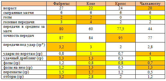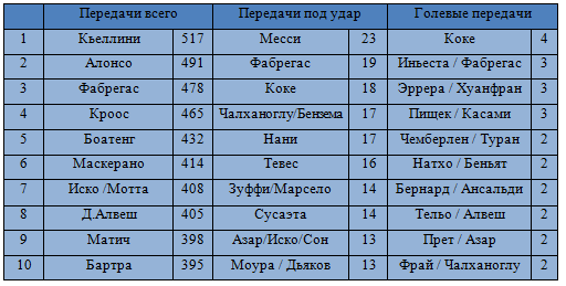 Самым пасующим игроком группового этапа стал защитник Кьеллини – 517 передач, за ним расположился Хаби Алонсо – 491 пас, а тройку замкнул Фабрегас – 478. А теперь сравним 4 центральных полузащитников, очень ярко проявивших себя.