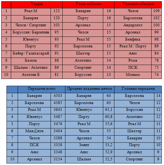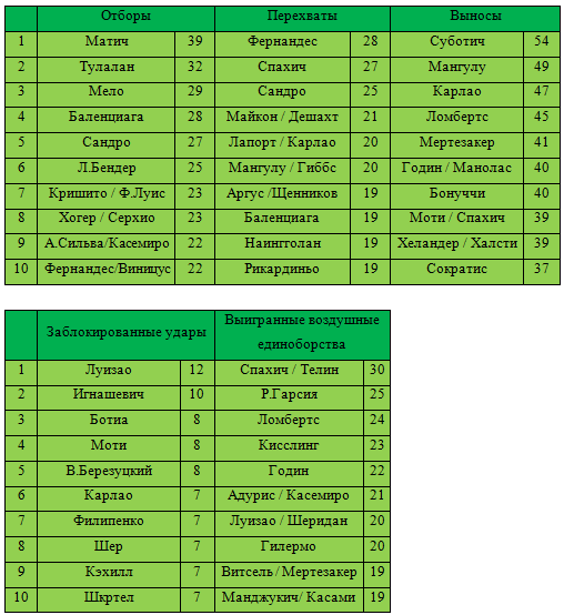 Приятно видеть на верхней строчке по количеству перехватов представителя РФПЛ. Марио Фернандес с 28 перехватами обошел всех, бразилец также имеет 10 показатель по числу отборов. Он наверняка своей игрой привлек внимание больших клубов, поэтому вполне вероятно, что в скором времени Фернандес отправится на повышение в какой-нибудь европейский чемпионат. Также обращают на себя внимание центральные защитники ЦСКА Василий Березуцкий и Сергей Игнашевич. Они стали одними из лучших в Лиге чемпионов по количеству заблокированных ударов. Первый 8 раз встал на пути мяча, а второй – 10. Еще из представителей российского первенства выделим Щенникова – 7й по перехватам, Ломбертса – 3й по выигранным воздушным единоборствам и Витселя – 8 показатель по игре на втором этаже. Не густо, конечно, но, по крайней мере, не пусто.