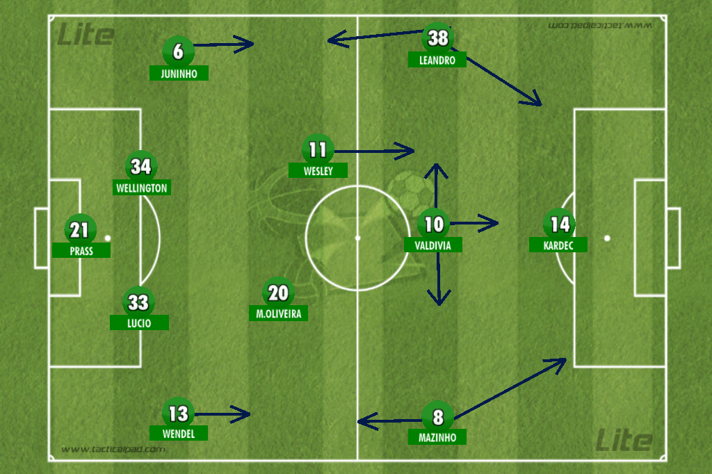 По краям, Kleina решил сохранить латералей Венделе и Жуниньо, несмотря на постоянную критику требовательных болельщиков alviverde. Двойной тандем воланте был образован из Марсело Оливейры и Уэсли, которые, как предполагалось помимо сугубо оборонительеных функций, должны были обеспечивать свободу действий Вальдивии.