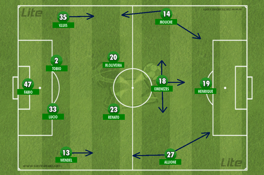 Как я сказал, в этих хождениях по мукам была использована схема 4-2-3-1, с Моуше и Эллионом по флангам, а Менезес занимал вакантное местечко в отсутствие Вальдивии.
